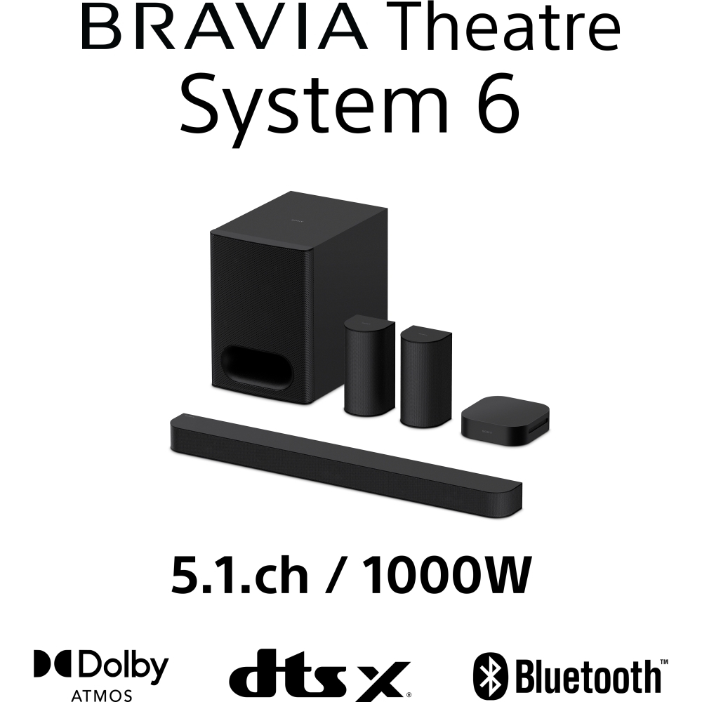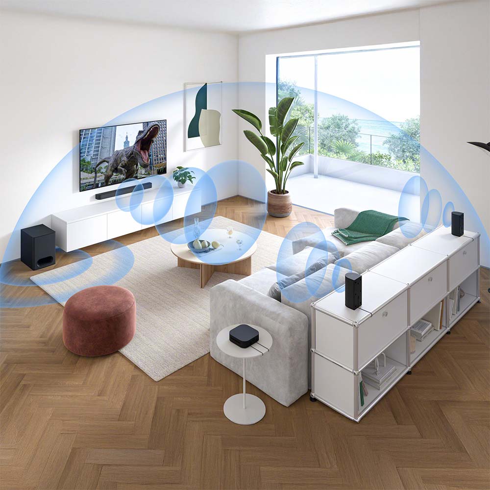 Turn up the energy with 5.1ch surround sound in minutes with easy setup. Powered by Dolby Atmos® and DTS:X®, this all-in-one system—soundbar, subwoofer and wireless rear speakers—delivers sound that dances around you.
